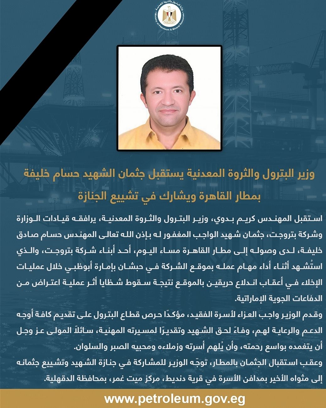 استقبل المهندس كريم بدوي، وزير البترول والثروة المعدنية، يرافقه قيادات الوزارة وشركة بتروجت، جثمان شهيد الواجب المغفور له بإذن الله تعالى المهندس حسام صادق خليفة، لدى وصوله إلى مطار القاهرة مساء اليوم، أحد أبناء شركة بتروجت، والذي استُشهد أثناء أداء مهام عمله بموقع الشركة في حبشان بإمارة أبوظبي خلال عمليات الإخلاء في أعقاب اندلاع حريقين بالموقع نتيجة سقوط شظايا أثر عملية اعتراض من الدفاعات الجوية الإماراتية.