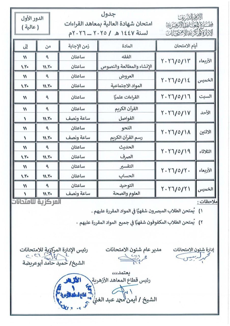 جداول امتحانات النقل والشهادات الأزهرية التي تم رفعها عبر المنصات الرسمية للأزهر الشريف وعلى رأسها "فيسبوك"، شملت تفاصيل دقيقة لمواعيد بدء ونهاية الاختبارات لكل صف دراسي.