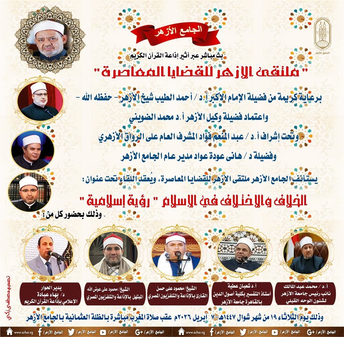 جدير بالذكر أن ملتقى "الأزهر للقضايا المعاصرة" يُعقد الثلاثاء من كل أسبوع في رحاب الجامع الأزهر الشريف، تحت رعاية فضيلة الإمام الأكبر وبتوجيهات من فضيلة الدكتور محمد الضويني وكيل الأزهر الشريف، حيث كان بمسمى "شبهات وردود" وتم تغييره لملتقى الأزهر للقضايا المعاصرة، بعد نجاحه طوال شهر رمضان والذي كان يعقد يوميًا عقب صلاة التراويح، ويتناول هذا الملتقى في كل حلقة قضية تهم المجتمع والوطن، والعالَمَين العربي والإسلامي.