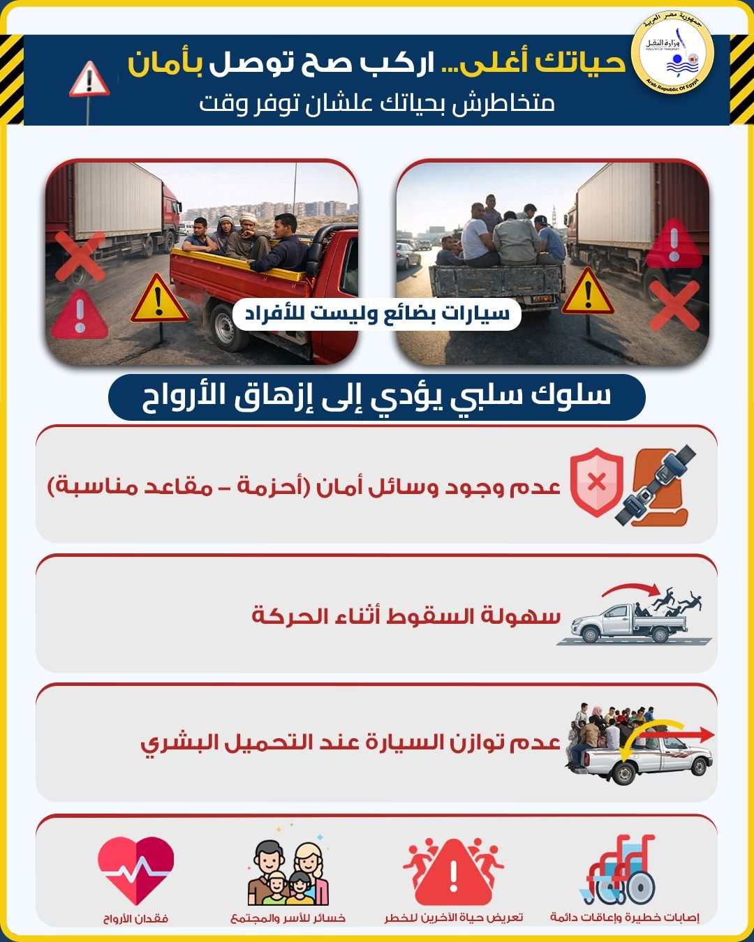 تتناول الحملة ظاهرة قيام بعض الأفراد بركوب العربات غير المخصصة لنقل الركاب، والتي تؤدي في كثير من الحالات إلى حوادث مميتة. وتؤكد الوزارة أن هذه الممارسات تعرض حياة الركاب والسائقين والمارة للخطر بشكل مباشر، لما لها من تأثير على السلامة المرورية، وقدرتها على التسبب في إصابات خطيرة أو فقدان الأرواح.