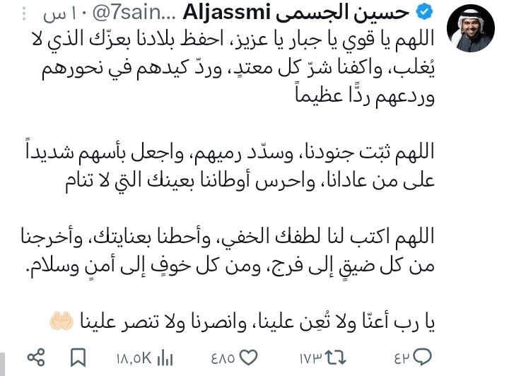 وكتب الجسمي عبر حسابه الرسمي على إكس:"اللهم يا قوي يا جبار يا عزيز، احفظ بلادنا بعزّك الذي لا يُغلب، واكفنا شرّ كل معتدٍ، وردّ كيدهم في نحورهم وردعهم ردًّا عظيماً".