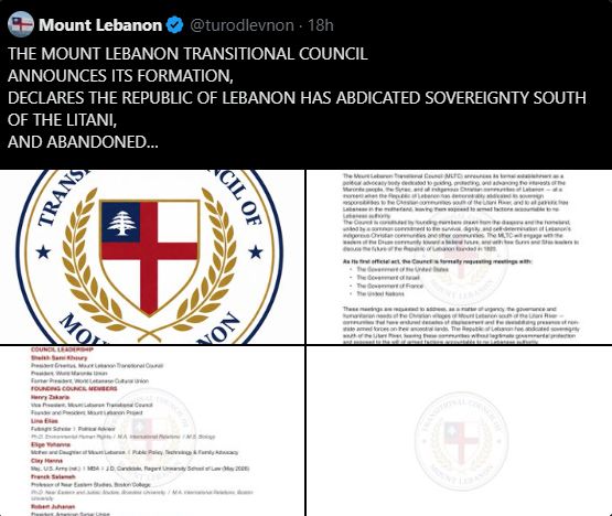 أعلن مسيحيو المهجر اللبنانيون فى الولايات المتحدة منذ قليل أنهم شكلوا مجلسا إنتقاليا لدولتهم الجديدة التى أسموها “ جمهورية جبل لبنان ”، وأصدروا بياانا معلنا على منصة “ إكس” أنهم كوّنوا مجلسا إنتقاليا لوضع تصور للجمهورية الجديدة.