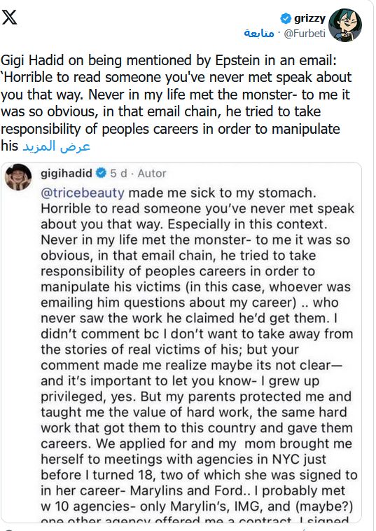 وأكدت جيجي حديد أن قراءة مثل هذه الادعاءات عن شخص لم تلتقي به في حياتها أمر صادم، خاصة في ظل حساسية القضية، قائلة إنها لم تقابل إبستين مطلقًا، ووصفت الحديث عنها في هذا السياق بأنه “مخزٍ”.