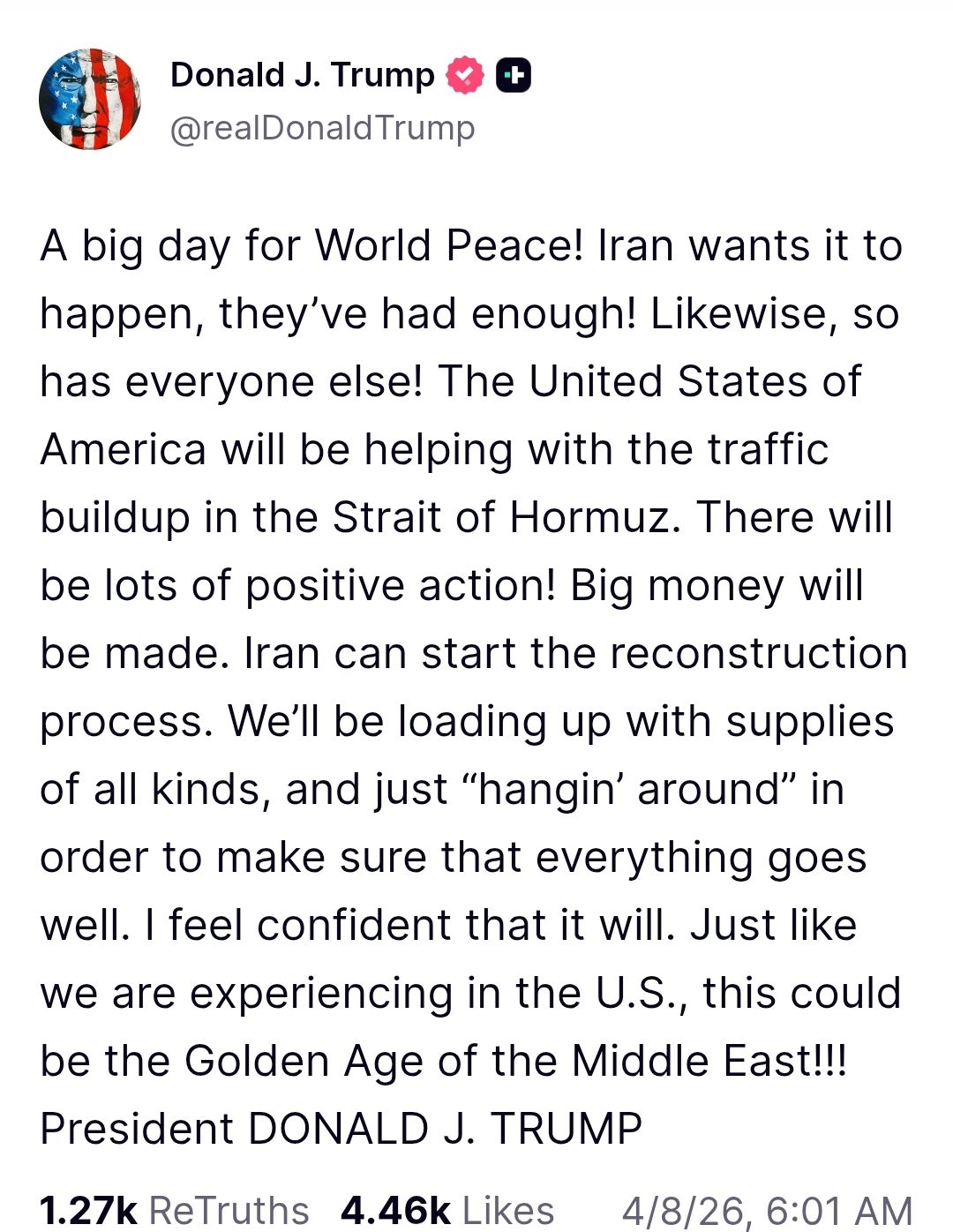 وكتب ترامب:" أنه يوم عظيم للسلام العالمي! إيران تريد تحقيق ذلك، لقد طفح بهم الكيل! وكذلك الجميع أيضاً! ستساعد الولايات المتحدة الأمريكية في معالجة تكدس حركة المرور في مضيق هرمز، وسيكون هناك الكثير من العمل الإيجابي! ستُجنى أموال طائلة".