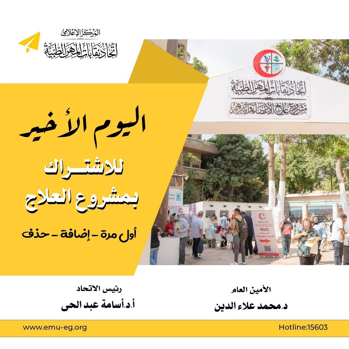 أعلنت الأمانة العامة لاتحاد نقابات المهن الطبية، أن غدًا الخميس 9 أبريل 2026 هو اليوم الأخير في الفترة الاستثنائية للاشتراك بمشروع علاج الأعضاء وأسرهم، داعية الأعضاء إلى سرعة التسجيل قبل انتهاء المهلة.