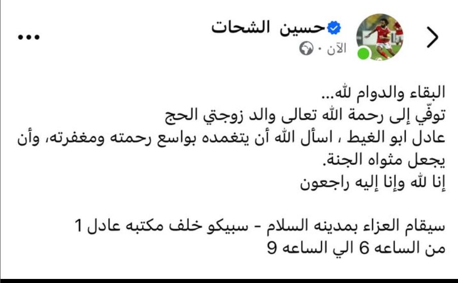 أعلن حسين الشحات نجم فريق النادي الأهلي عن وفاة والد زوجته عبر حسابه الشخصي بموقع التواصل الاجتماعي "فيس بوك".