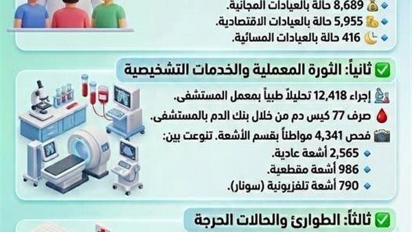 وفي ادارة المعامل والخدمات التشخيصية ، واصلت أقسام الأشعة والمعامل تقديم خدماتها بدقة وسرعة قياسية خلال شهر مارس، حيث تم إجراء 12,418 تحليلاً طبياً بمعمل المستشفى ، صرف 77 كيس دم من خلال بنك الدم بالمستشفى، فحص 4,341 مواطناً بقسم الأشعة، تنوعت ما بين ، 2,565 أشعة عادية،986 أشعة مقطعية،790 أشعة تلفزيونية (سونار).