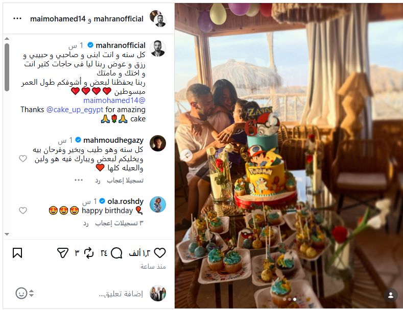 ونشر محمد مهران مجموعة من الصور ومقاطع الفيديوهات التي جمعته بنجله عبر حسابه الشخصي على منصة تبادل الصور والفيديوهات إنستجرام، وعلق قائلاً:"كل سنة وأنت ابنى وصاحبي وحبيبي ورزق وعوض ربنا ليا في حاجات كتير أنت وأختك ومامتك، ربنا يحفظنا لبعض وأشوفكم طول العمر مبسوطين".