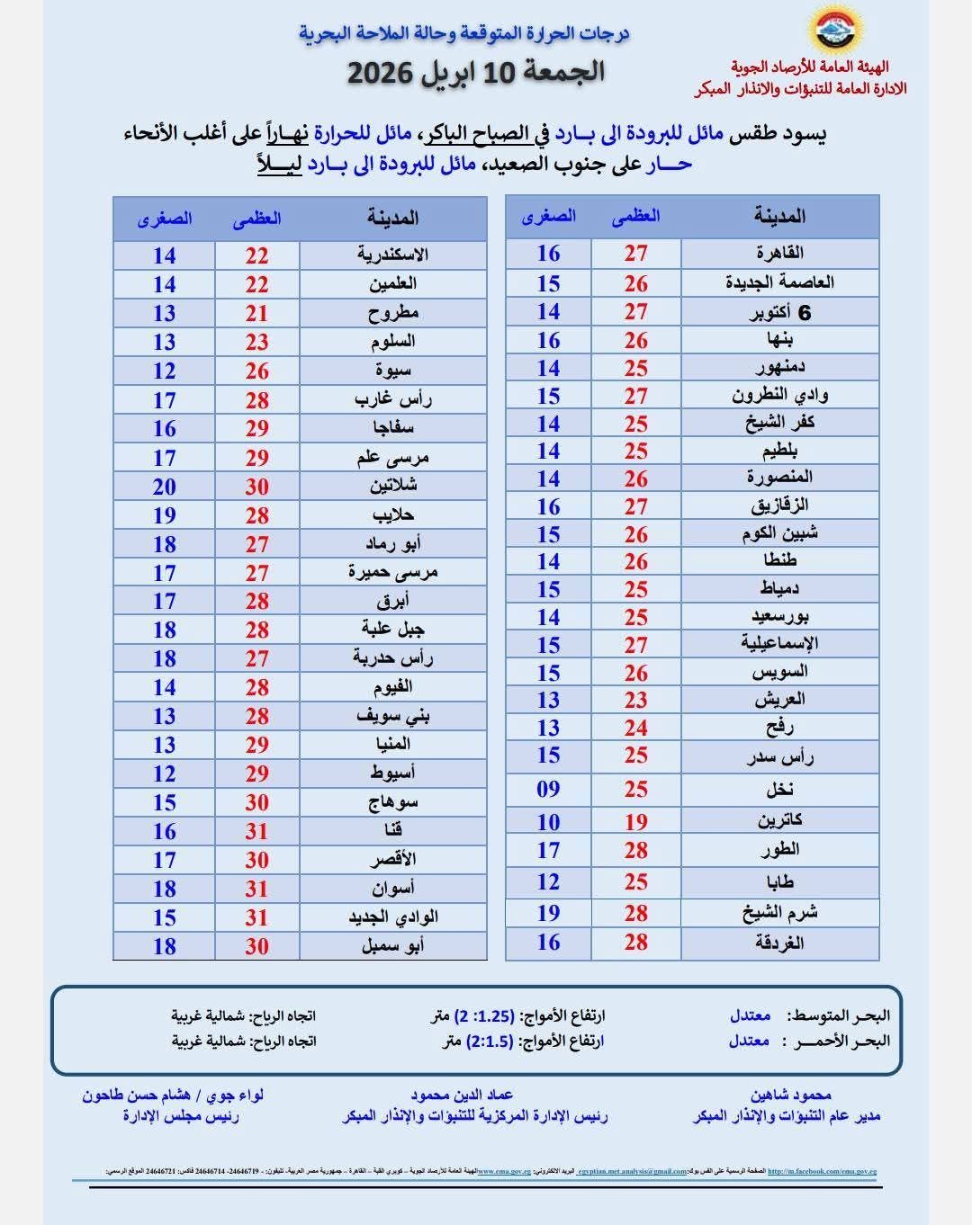 درجات الحرارة وحالة الطقس.. يشهد غدا الجمعة الموافق 10 ابريل 2026، طقس مائل إلى البرودة إلى بارد في الصباح الباكر، مائل للحرارة نهاراً على أغلب الانحاء حار على جنوب الصعيد، ومائل للبرودة ليلا.