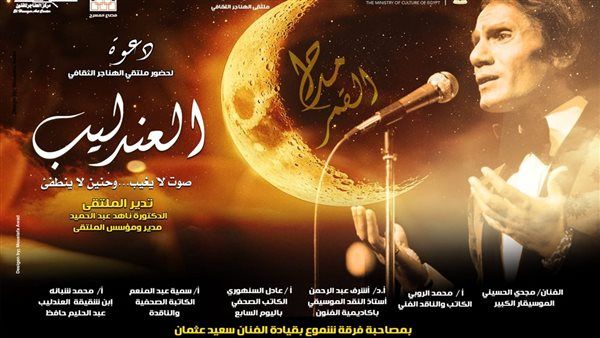 ضمن فعاليات وزارة الثقافة، ينظم قطاع المسرح برئاسة المخرج هشام عطوة، ملتقى الهناجر الثقافي تحت عنوان “العندليب صوت لا يغيب وحنين لا ينطفئ”، وذلك في تمام الساعة الخامسة والنصف من مساء اليوم الجمعة، بمركز الهناجر للفنون برئاسة الفنان شادي سرور.