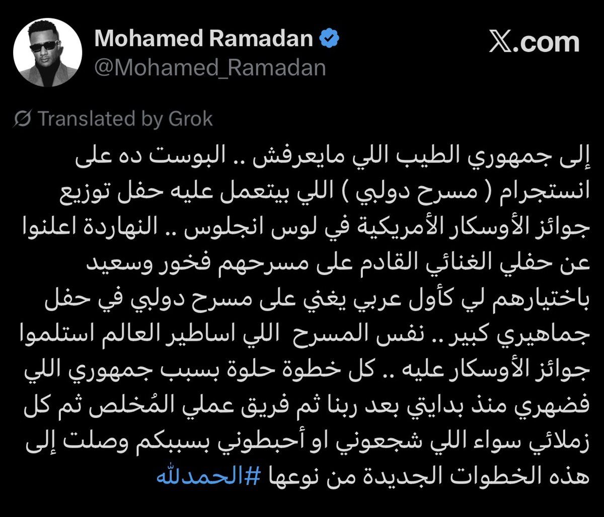 كشف الفنان محمد رمضان عن خطوة فنية جديدة في مسيرته، بعد إعلانه إحياء حفل غنائي على مسرح "دولبي" في مدينة لوس أنجلوس وهو المسرح الذي يستضيف حفل توزيع جوائز الأوسكار، معبرًا عن فخره بهذه المشاركة التي وصفها بالإنجاز المهم في مشواره.