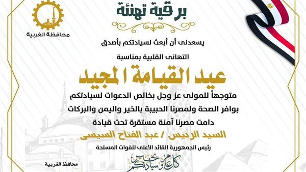 بعث اللواء دكتور علاء عبدالمعطي، محافظ الغربية، برقية تهنئة إلى قداسة البابا تواضروس الثاني، بمناسبة الاحتفال بعيد القيامة المجيد، جاء نصها: