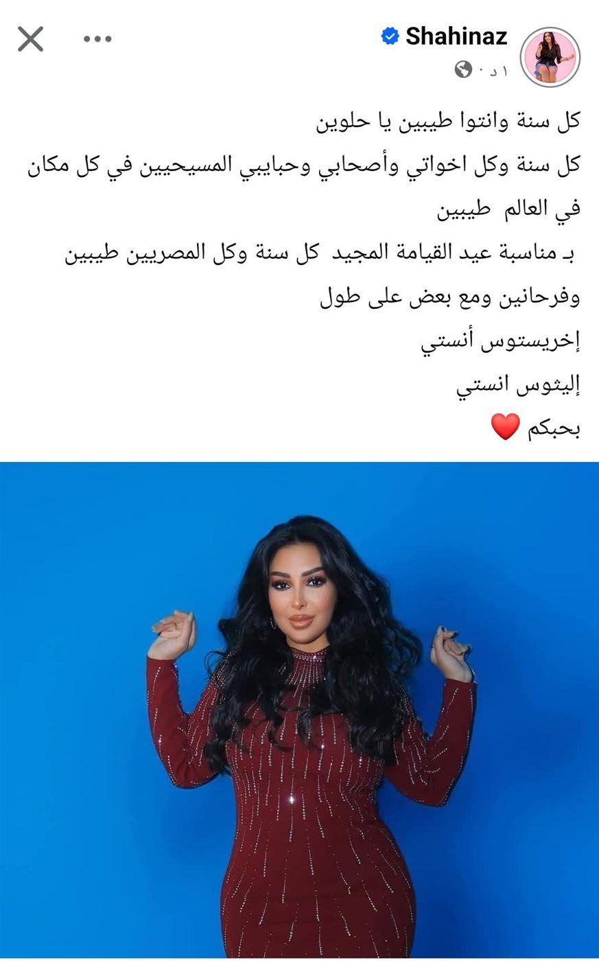 حرصت المطربة شاهيناز على تهنئة الأقباط بمناسبة عيد القيامة المجيد، وذلك من خلال منشور عبر حسابها الرسمي على موقع فيسبوك.