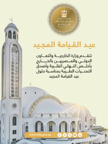 تقدمت وزارة الخارجية والتعاون الدولي والمصريين بالخارج بأخلص التهاني القلبية وأصدق التمنيات الطيبة إلى الشعب المصري، وخاصة الإخوة الأقباط، بمناسبة حلول عيد القيامة المجيد.