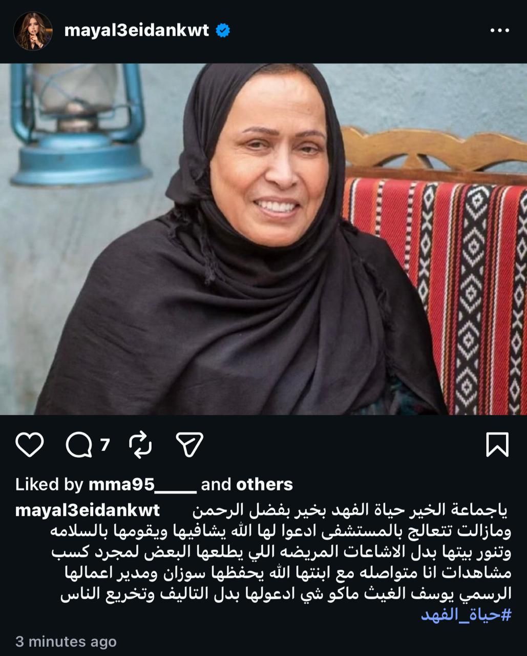 نشرت مي العيدان صورة حياة الفهد وأرفقتها بتعليق قائلة: “يا جماعة الخير حياة الفهد بخير بفضل الرحمن ومازالت تتعالج بالمستشفى ادعوا لها الله يشافيها ويقومها بالسلامه وتنور بيتها بدل الاشاعات المريضه اللي يطلعها البعض لمجرد كسب مشاهدات”.