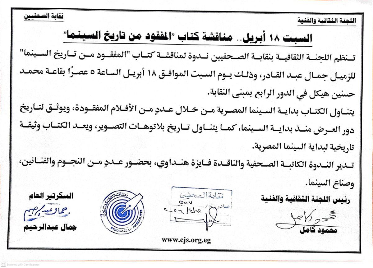 تنظم اللجنة الثقافية بنقابة الصحفيين، ندوة لمناقشة كتاب "المفقود من تاريخ السينما" للزميل جمال عبد القادر، وذلك يوم السبت الموافق 18 أبريل الساعة 5 عصرًا بقاعة محمد حسنين هيكل في الدور الرابع بمبنى النقابة.