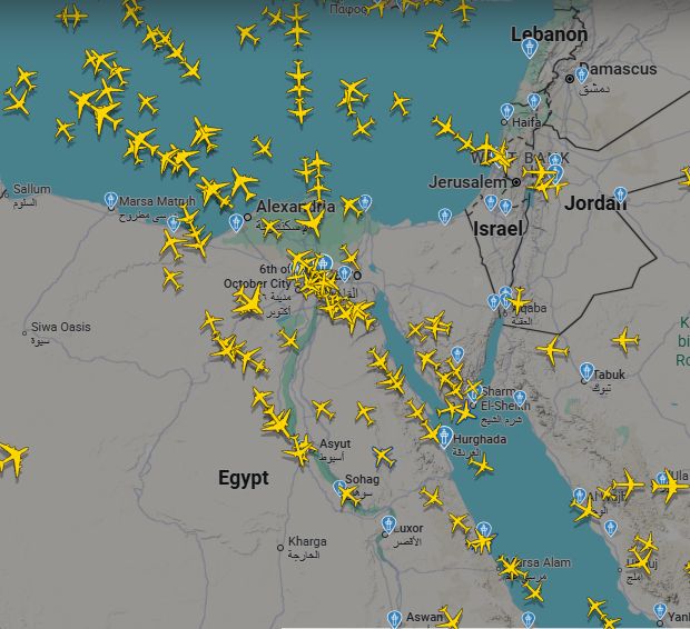 كما أبرز الموقع الجوى حركة الطائرات حول المجال الجوى المصرى واصفا إياه بالكثيف، حيث تتوجه الطائرات عبر مطار القاهرة من الجنوب الى أوروبا والعكس من الشمال الى منطقة الخليج وجنوب شرق آسيا، وقد شهدت حركة الطيران نشاطا كثيفا بعد إعلان إستئناف الحر الأمريكية على إيران مرة أخرى، وكانت جميع شركات الطيران الدولية فى أوروبا قد أعلنت عن قلقلها من نفاذ الكيروسين المسؤول عن تموين الطائرات خلال الثلاث أسابيع القادمة إن إستمر مضيق هرمز مغلقا، حيث يعد المضيق هو الممر الرئيسى فى نقل النفط ومشتقاته من الخليج العربى الى أوروبا.
