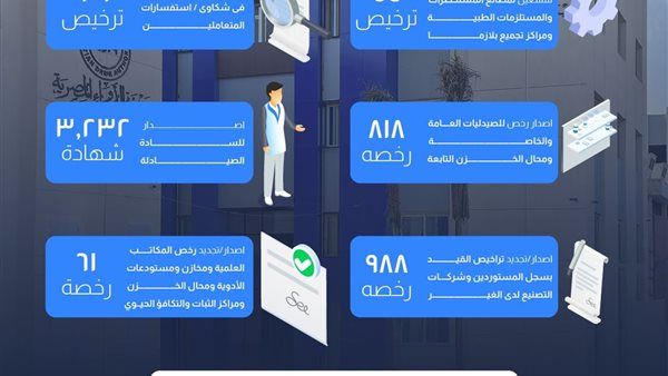 و أسفرت الخدمات المقدمة من خلال المنصة الإلكترونية عن إصدار عدد (2526) شهادة تعيين مدير لصيدلية عامة، و(70) شهادة فتح صيدلية جديدة، و(7) شهادات إدارية، و(4) شهادات خبرة من خلال المنصة الإلكترونية، بالإضافة إلى إصدار عدد (210) شهادة تعيين مدير، و(120) شهادة فتح صيدلية جديدة، و(211) شهادة نقل ملكية، وتجديد عدد (16) شهادة فتح صيدلية، و(68) شهادة نقل ملكية من خلال الطلبات الورقية. https://serviceportal.edaegypt.gov.eg