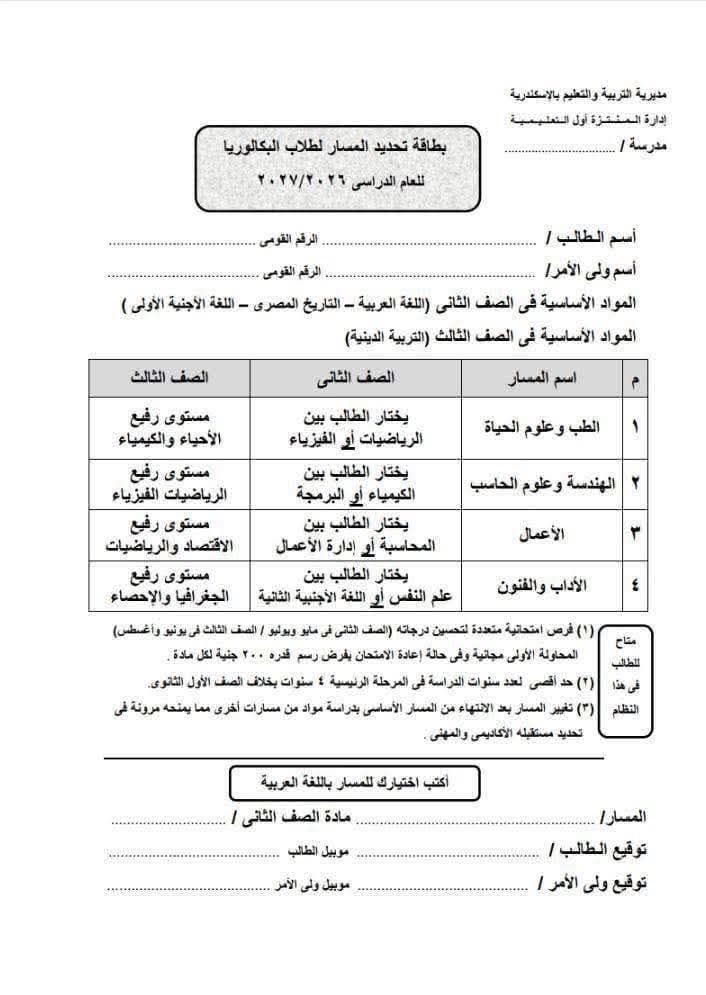بدأت مدارس الثانوية العامة توزيع استمارة تحديد مسار نظام البكالوريا المصرية على طلاب الصف الأول للعام الدراسي الحالي 2025-2026.