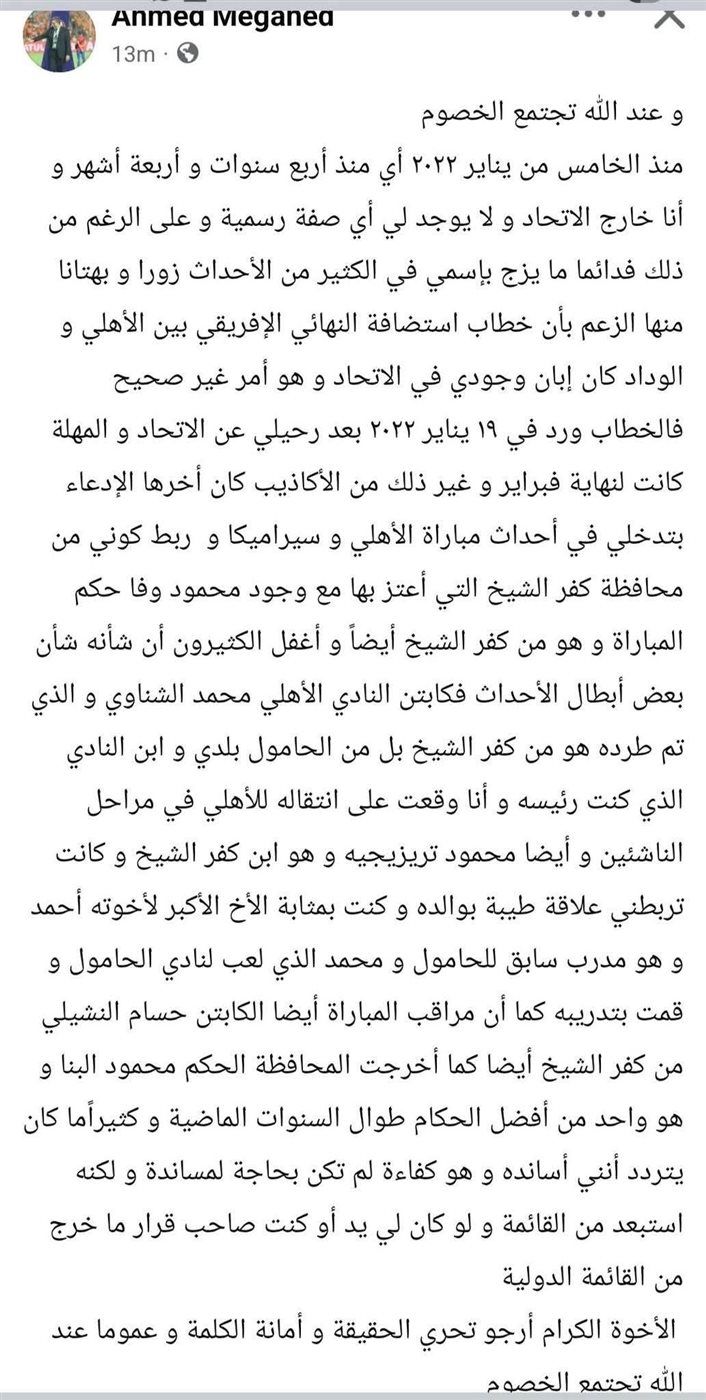 وكتب أحمد مجاهد عبر حسابه الشخصي على موقع التواصل الاجتماعي فيسبوك: “ منذ الخامس من يناير 2022 أي منذ أربع سنوات وأربعة أشهر وأنا خارج الاتحاد ولا يوجد لي أي صفة رسمية وعلى الرغم من ذلك فدائما ما يزج بإسمي في الكثير من الأحداث زورا وبهتانا منها الزعم بأن خطاب استضافة النهائي الإفريقي بين الأهلي والوداد كان إبان وجودي في الاتحاد وهو أمر غير صحيح فالخطاب ورد في 19 يناير 2022 بعد رحيلي عن الاتحاد والمهلة كانت لنهاية فبراير.