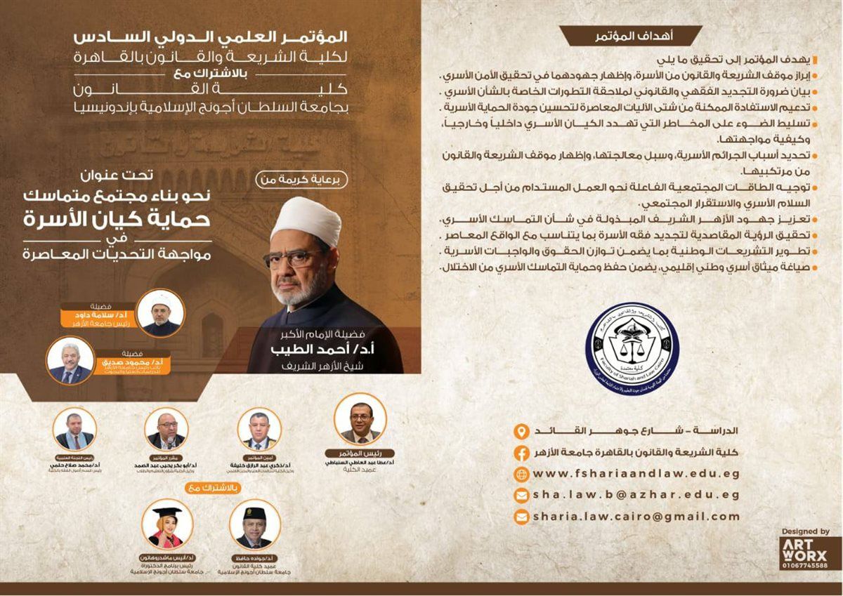 تنظم كلية الشريعة والقانون بالقاهرة جامعة الأزهر، مؤتمرها العلمي الدولي السادس يومي السبت والأحد الموافق 18 و 19 أبريل الجاري 2026م بقاعة الأزهر للمؤتمرات بمدينة نصر.