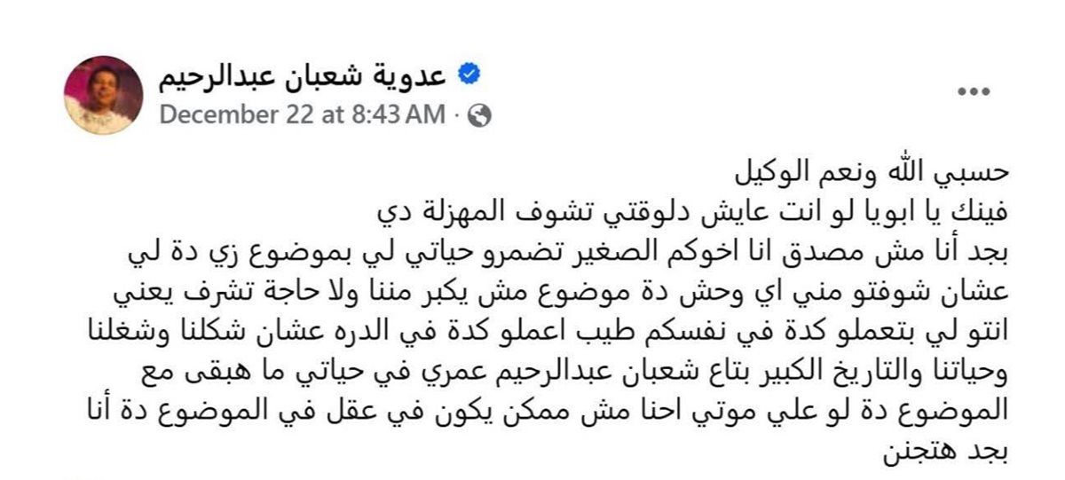 وقال: "حسبي الله ونعم الوكيل.. فينك يا أبويا لو أنت عايش دلوقتي تشوف المهزلة دي، بجد أنا مش مصدق، أخوكم الصغير تدمروا حياته بموضوع زي ده".