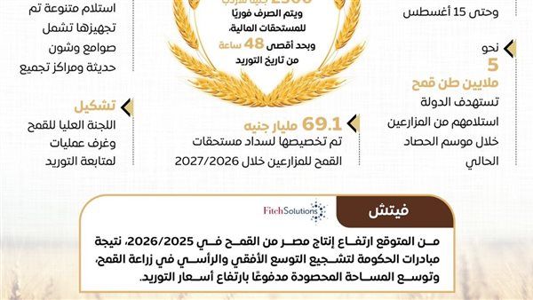 وفي سياق متصل، لفت الإنفوجراف إلى توقع وكالة "فيتش" ارتفاع إنتاج مصر من القمح في 2025/2026، نتيجة مبادرات الحكومة لتشجيع التوسع الأفقي والرأسي في زراعة القمح، وتوسع المساحة المحصودة مدفوعًا بارتفاع أسعار التوريد
