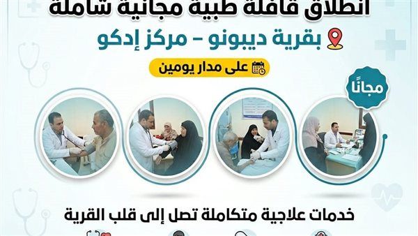 حيث تنظم مديرية الصحة بالبحيرة، بقيادة الدكتور إسلام عساف، قافلة طبية مجانية متعددة التخصصات بقرية ديبونو التابعة لمركز إدكو، وذلك على مدار يومي الجمعة والسبت الموافقين 17 و18 أبريل الجاري، لتقديم خدماتها لأهالي القرية والعزب والنجوع المجاورة.