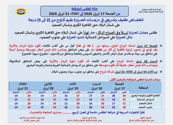 وأوضحت أنه بداية من غدٍ الجمعة 17 أبريل، ستنشط الرياح بسرعة تتراوح من 40 إلي 50 كم/ س علي أغلب الأنحاء تكون مثيرة للرمال والأتربة وقد تؤدي إلى تدهور الرؤية الأفقية الى أقل من 1000 متر على بعض المناطق يصاحب ذلك فرص أمطار متوسطة ورعدية أحيانًا على مناطق من سيناء وسلاسل جبال البحر الأحمر وخليجي السويس والعقبة ومناطق من السلوم - مطروح - سيوة العلمين).