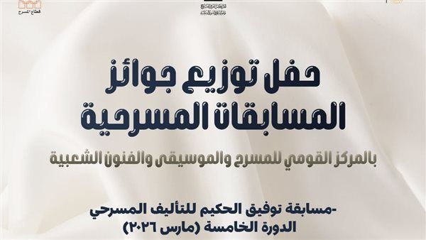 في إطار دعم وزارة الثقافة للكُتاب المسرحيين، وتقديم مبدعين جدد في مجال الكتابة المسرحية، وتحت رعاية الدكتورة جيهان زكي وزيرة الثقافة، وبإشراف رئيس قطاع المسرح الدكتور أيمن الشيوي، ينظم المركز القومي للمسرح والموسيقى والفنون الشعبية، برئاسة المخرج عادل حسان، حفل توزيع جوائز الفائزين بمسابقات التأليف المسرحي، وهي: