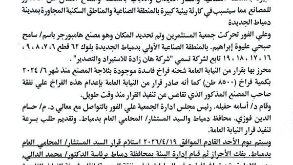 تشهد المنطقة الصناعية بمدينة دمياط الجديدة حالة من الاستنفار، عقب الكشف عن أزمة بيئية خطيرة ناتجة عن تخزين كميات ضخمة من الدواجن الفاسدة داخل أحد المصانع، ما تسبب في انبعاث روائح كريهة وانتشار الحشرات، وأثر بشكل مباشر على سير العمل داخل عدد من المنشآت المجاورة.