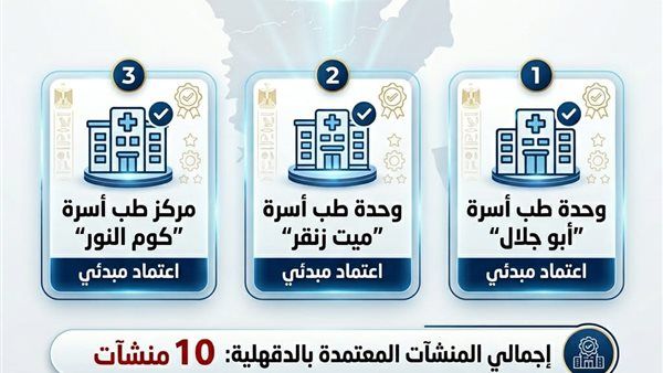 وأوضح وكيل الوزارة، أن القرارات تضمنت حصول وحدة طب أسرة “أبو جلال”، ووحدة طب أسرة “ميت زنقر”، ومركز طب أسرة “كوم النور” على الاعتماد المبدئي، بما يعكس التزام الفرق الطبية والإدارية بتطبيق معايير الجودة، وحرصهم على تقديم خدمات صحية آمنة وفعالة وفقًا لأحدث النظم المعتمدة.