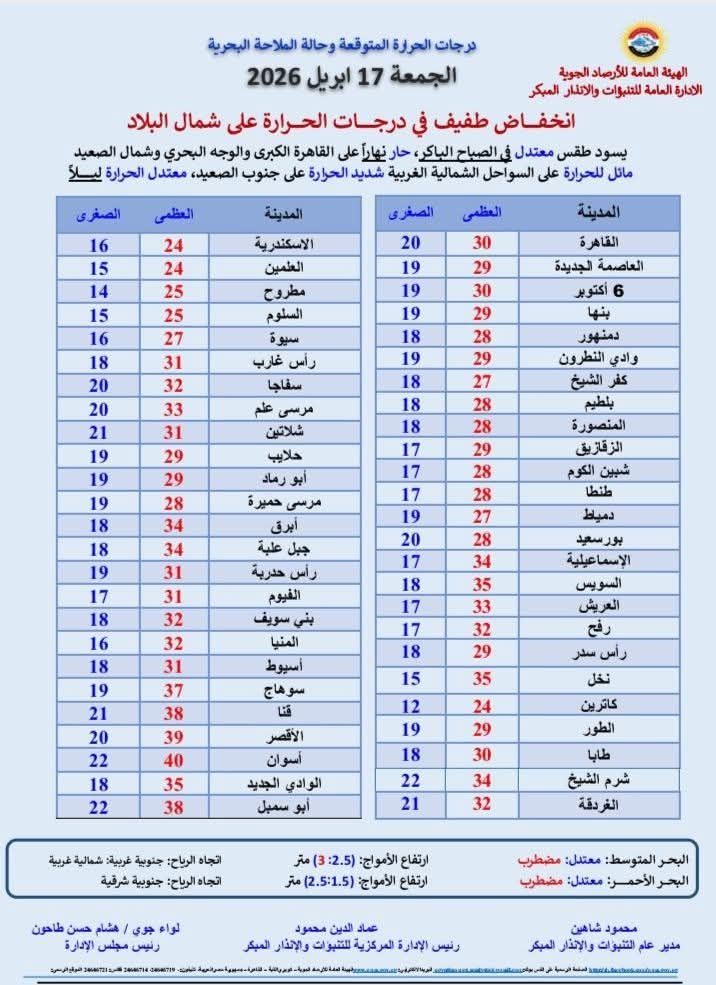 تنخفض درجات الحرارة بشكل طفيف على شمال البلاد اليوم الجمعة الموافق 17 أبريل، كما يشهد اليوم أجواء مغبرة على أغلب الأنحاء يصاحبها انخفاض فى مستوى الرؤية الأفقية، وذلك بحسب توقعات الهيئة العامة للأرصاد الجوية.