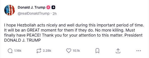 وجه الرئيس الأمريكى دونالد ترامب رسالة إلى حزب الله فى منشور جديد على موقع “ تروث سوشيال” يخاطبهم فيها وكأنهم أطفال بقوله “ أتمنى أن يتصرف حزب الله بلطف وطريقة جيدة أثناء هذه الفترة الهامة من الوقت، والتى سوف تكون لحظة عظيمة لهم إذا إمتنعوا فيها عن القتل ، وعليهم أن يحصلوا على السلام !، لأشكركم على إنتباهكم لهذا الأمر..الرئيس دونالد ترامب”.