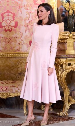 خلال حفل الغداء الذي أقيم على شرف الفائزين بجائزة سيرفانتيس لعام 2023 في القصر الملكي في مدريد بدت الملكة ليتيزيا بإطلالة أنيقة شديدة الرومانسية، حيث ارتدت فستاناً باللون الزهري الفاتح المبودر من تصميم بيدرو ديل هيرو Pedro del Hierro، الفستان تميز بأكتافه المحددة وأكمامه الطويلة وتنورته المتسعة مع القليل من الكسرات تصل إلى أسفل الركبتين، وعند الكتف الأيمن والخصر تظهر زهور ثبتت فوق الفستان بكل نعومة، فيما تناثرت زهور أخرى فوق التنورة.