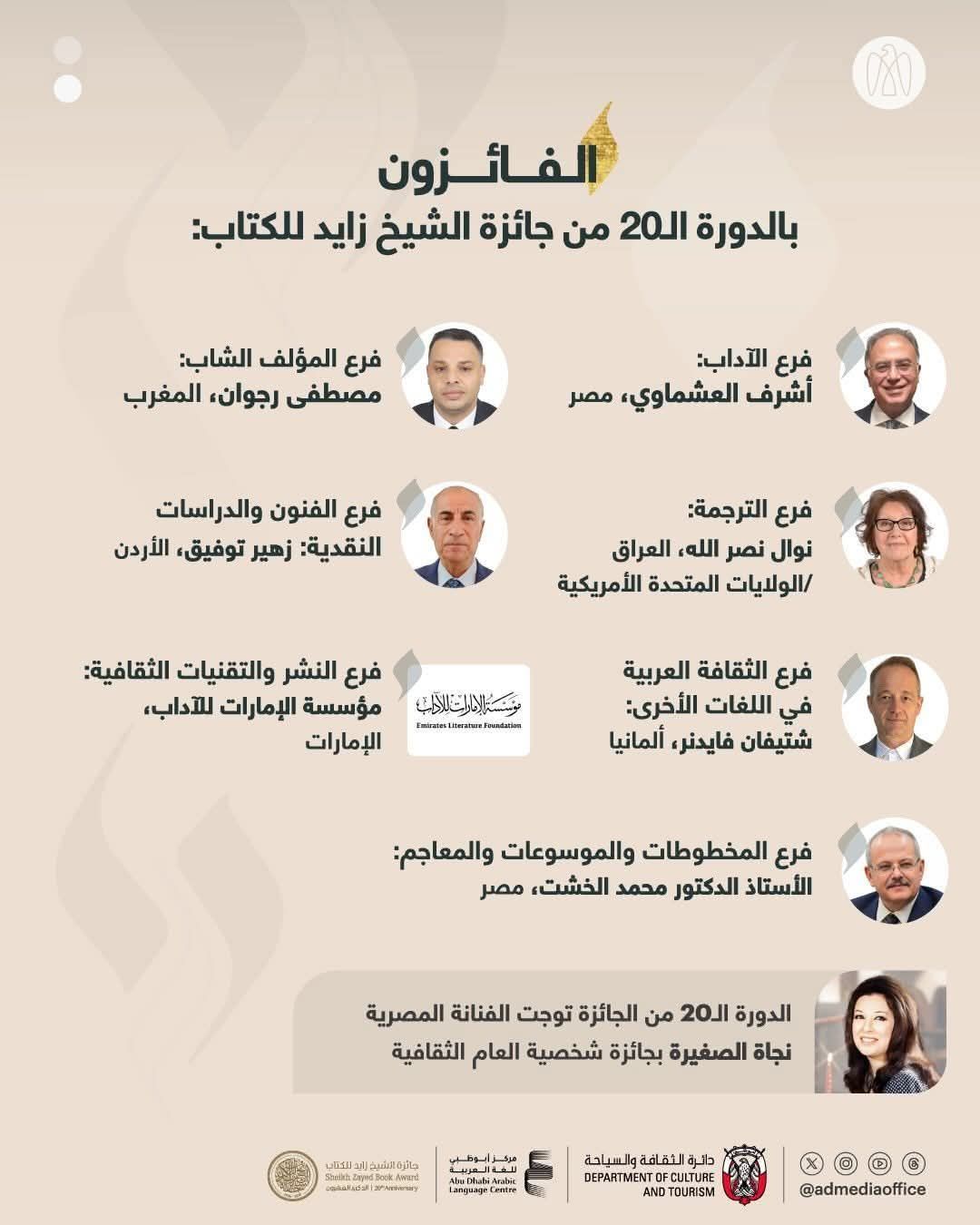 كانت أمانة الجائزة قد أعلنت النتيجة مساء اليوم الجمعة، حيث توجت كذلك الفنانة نجاة الصغيرة، بجائزة شخصية العام الثقافية.