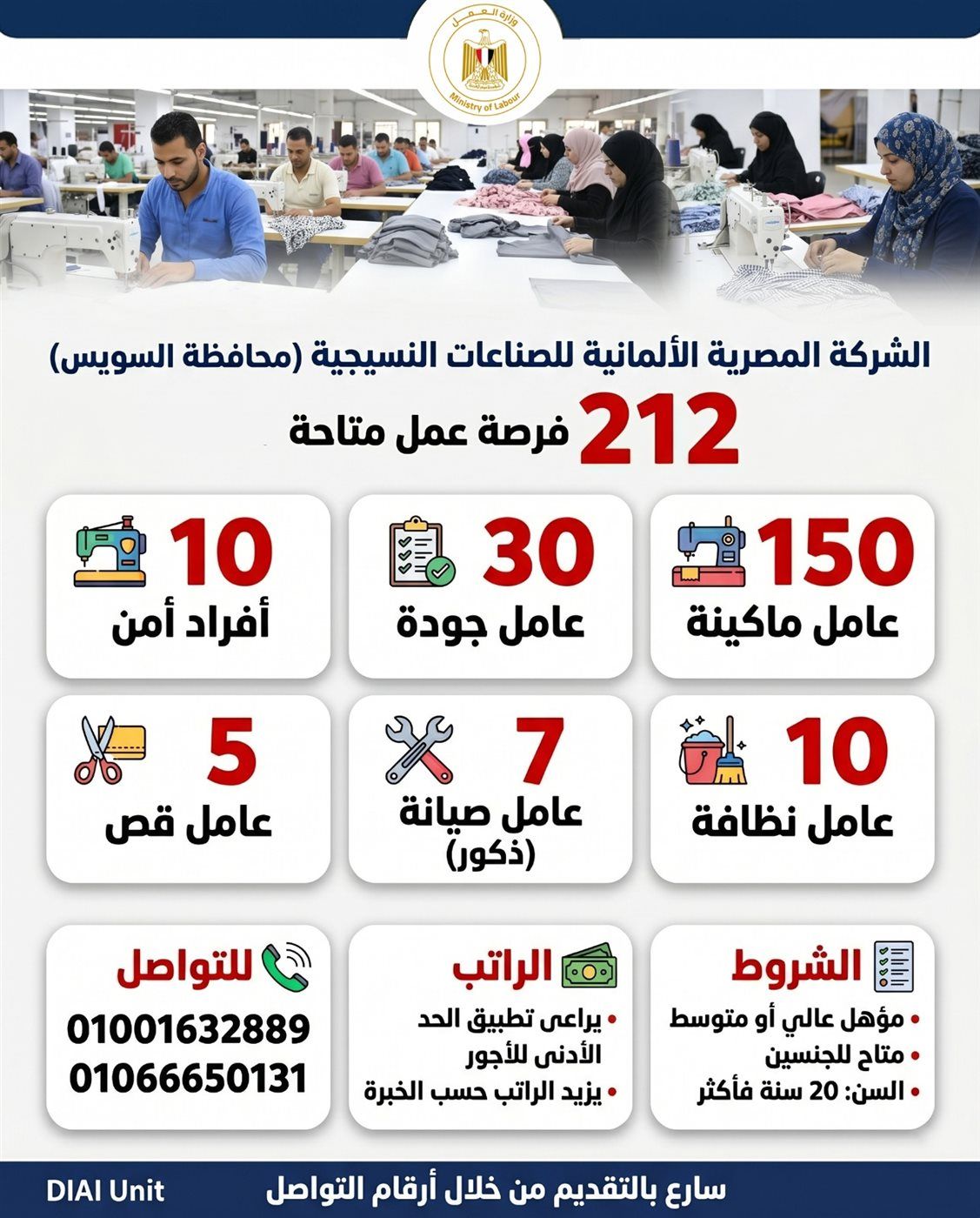 أعلنت وزارة العمل، عن فرص عمل جديدة في الشركة المصرية الألمانية للصناعات النسيجية بمحافظة السويس، حيث يصل عدد الفرص لـ 212 وظيفة جديدة متاحة.