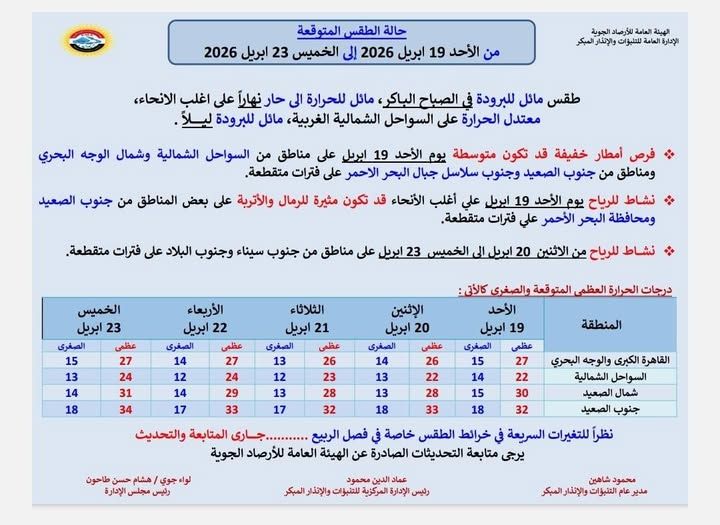 وتابعت: نشاط للرياح من الإثنين 20 أبريل إلى الخميس 23 أبريل على مناطق من جنوب سيناء وجنوب البلاد على فترات متقطعة.