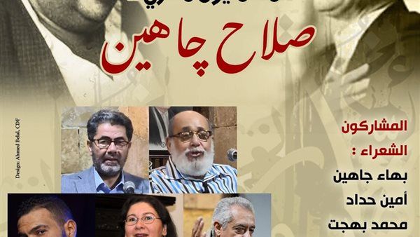 تحت عنوان"المئة مليون مصري.. صلاح جاهين” ينظم بيت الشعر العربي (بيت الست وسيلة) خلف الجامع الأزهر، التابع لقطاع صندوق التنمية الثقافية، أمسية جديدة ضمن صالون الشاعر الكبير أحمد عبد المعطي حجازي، وذلك في السادسة من مساء غد الأحد 19 أبريل.