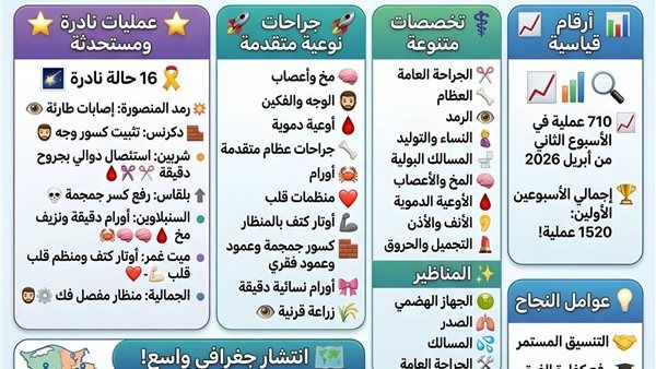 وأضافت أن الفترة شهدت تنفيذ عدد من الجراحات النوعية المتقدمة، شملت جراحات دقيقة في المخ والأعصاب والوجه والفكين والأوعية الدموية وجراحات العظام المتقدمة وجراحات الأورام، إلى جانب عمليات تركيب منظمات القلب وإصلاح أوتار الكتف بالمنظار وتثبيت كسور الجمجمة والعمود الفقري واستئصال أورام نسائية دقيقة وجراحات دقيقة للعين وزراعة القرنية.