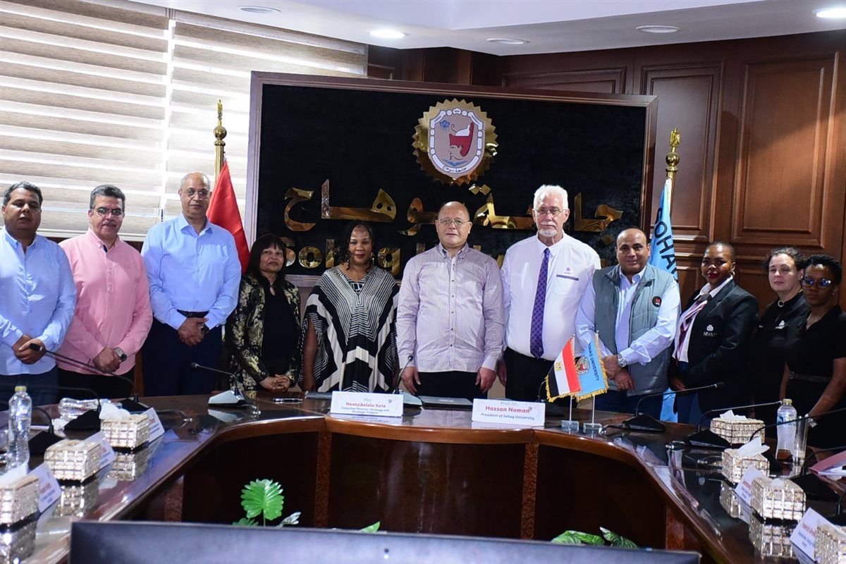 وقع الدكتور حسان النعماني رئيس جامعة سوهاج، بروتوكول تعاون مشترك مع جامعة نورث ويست بجنوب أفريقيا، ممثلة في السيدة Mrs. Nontsikelelo Kote نائب رئيس الجامعة، وذلك في إطار توجه الجامعة نحو تعزيز التعاون الدولي والانفتاح على المؤسسات الأكاديمية المتميزة عالميًا.