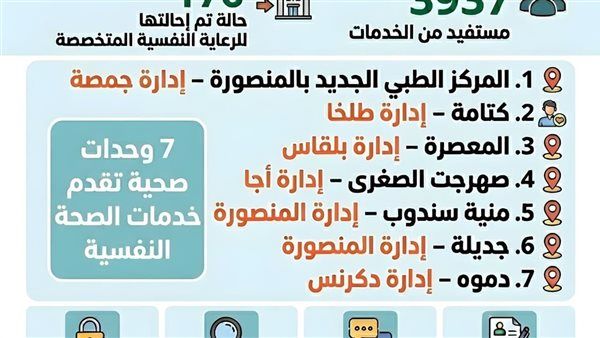 وأوضح وكيل الوزارة، أن خدمات الدعم النفسي تُقدم بعدد من الوحدات الصحية، وتشمل:وحدة منية سندوب، وحدة جديلة ، إدارة المنصورة الصحية، والمركز الطبي بالمنصورة الجديدة ، إدارة جمصة الصحية، وحدة كتامة – إدارة طلخا الصحية، وحدة المعصرة ، إدارة بلقاس الصحية، وحدة صهرجت الصغرى – إدارة أجا الصحية، وحدة دموه – إدارة دكرنس الصحية.