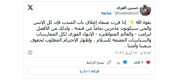 وفي تصريح جريء عبر منصة "إكس"، شدد العزي على أن قرار إغلاق باب المندب، حال اتخاذه، سيكون بمثابة تحدٍ يستحيل تجاوزه، مضيفًا: "إذا قررنا إغلاق المضيق، فلن يستطيع أحد، سواء من البشر أو القوى الأخرى، إعادة فتحه". كما دعا إلى إنهاء السياسات والممارسات التي تُعيق السلام وضرورة احترام حقوق الشعب اليمني والدول الإقليمية.