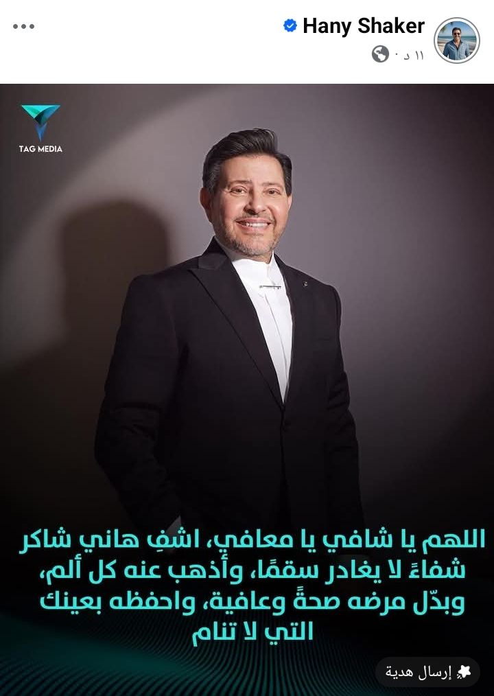وكتب قائلًا: "اللهم يا شافي يا معافي، اشفِ هاني شاكر شفاءً لا يغادر سقمًا، وأذهب عنه كل ألم، وبدّل مرضه صحةً وعافية، واحفظه بعينك التي لا تنام".