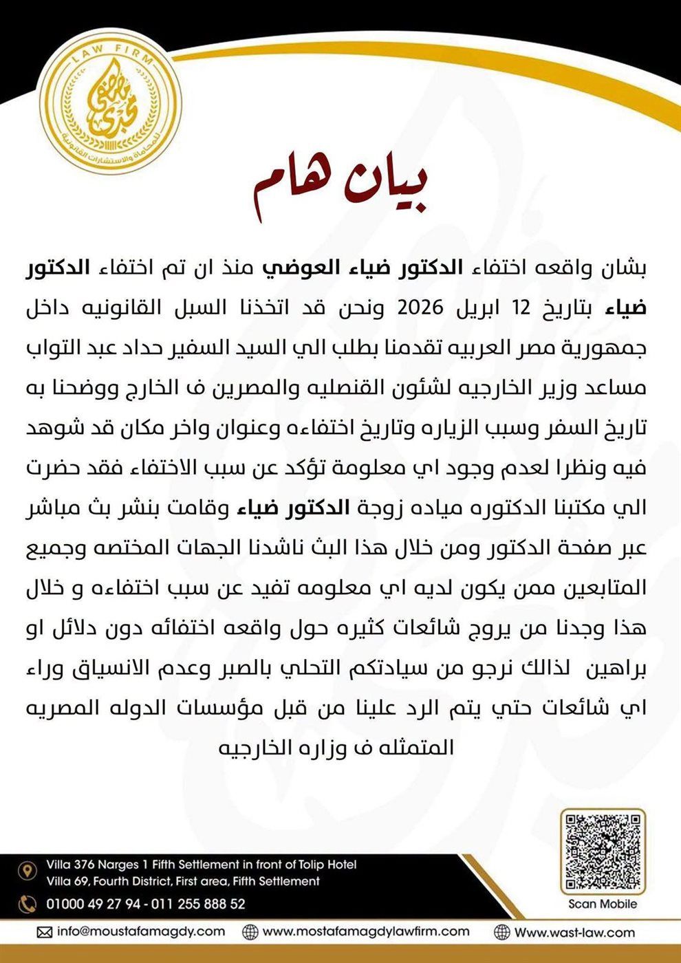وجاء البيان كالتالي: “بشان واقعة اختفاء ضياء العوضي منذ ان تم اختفاء ضياء بتاريخ 12 ابريل 2026 ونحن قد اتخذنا السبل القانونيه داخل جمهورية مصر العربيه تقدمنا بطلب الي السفير حداد عبد التواب مساعد وزير الخارجيه لشئون القنصليه والمصرين ف الخارج ووضحنا به تاريخ السفر وسبب الزيارة وتاريخ اختفاءه وعنوان واخر مكان قد شوهد فيه”.