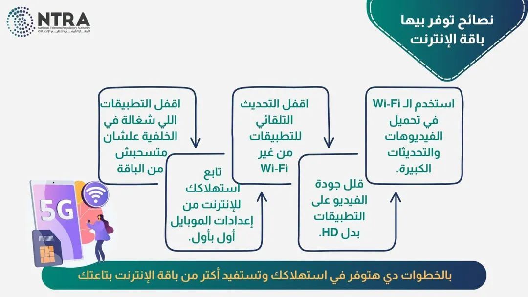 في ظل الاعتماد المتزايد على الخدمات الرقمية والتحول نحو الاقتصاد الرقمي الذي تشهده البلاد، كشف الجهاز القومي لتنظيم الاتصالات (NTRA) عن حزمة من الإرشادات والتوعية التقنية الموجهة لجمهور المستخدمين، تهدف إلى مساعدتهم في "ترشيد استهلاك باقة الإنترنت" وضمان استمرار الخدمة لأطول فترة ممكنة دون انقطاع.