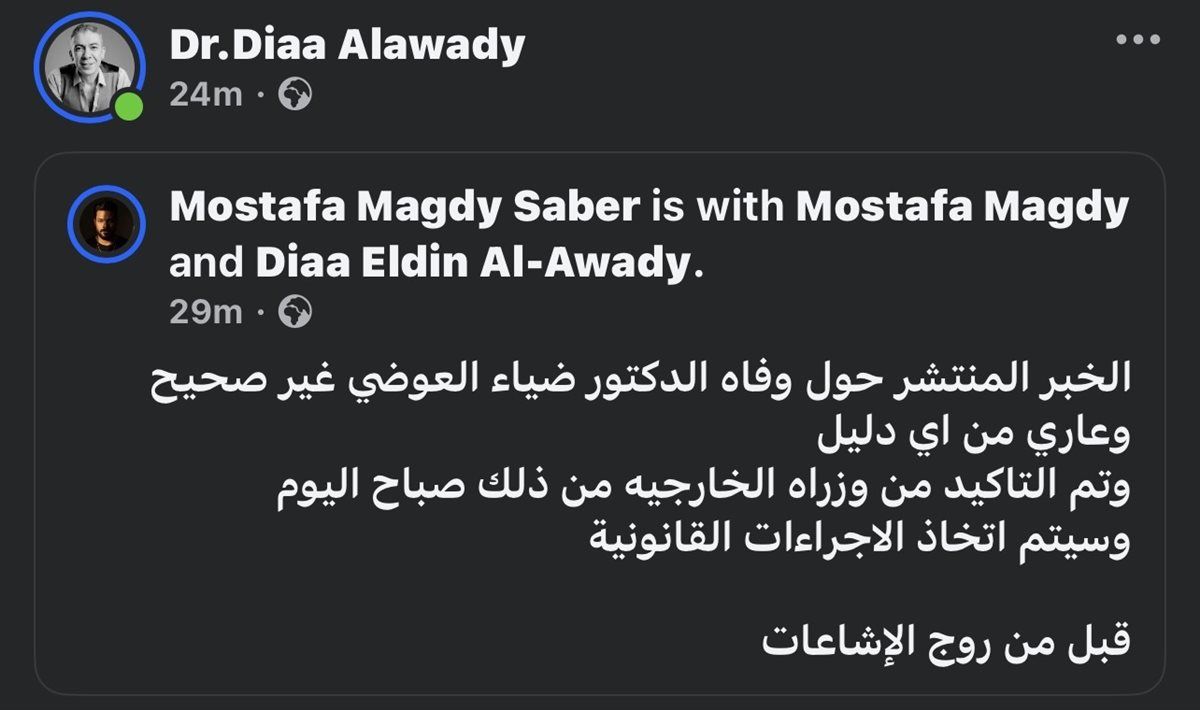 كتبت صفحة ضياء العوضي: “الخبر المنتشر حول وفاه الدكتور ضياء العوضي غير صحيح وعاري من اي دليل”.