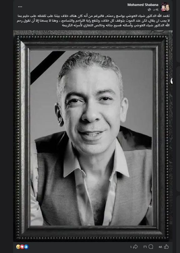 حرص محمد شبانة، نجل شقيق العندليب عبد الحليم حافظ، على نعي الدكتور ضياء العوضي، عبر منشور على حسابه الرسمي بالموقع الأشهر "فيسبوك"، عكس فيه موقفًا إنسانيًا رغم وجود خلافات سابقة بينهما.