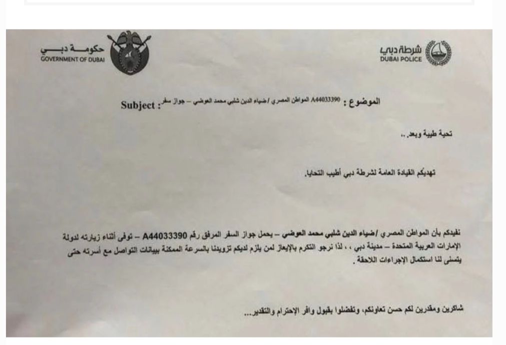 وفي السياق ذاته، تتابع القنصلية المصرية في دبي الإجراءات بالتنسيق مع السلطات الإماراتية، تمهيدًا لإنهاء إجراءات شحن الجثمان إلى مصر عقب الانتهاء من التقارير الرسمية.