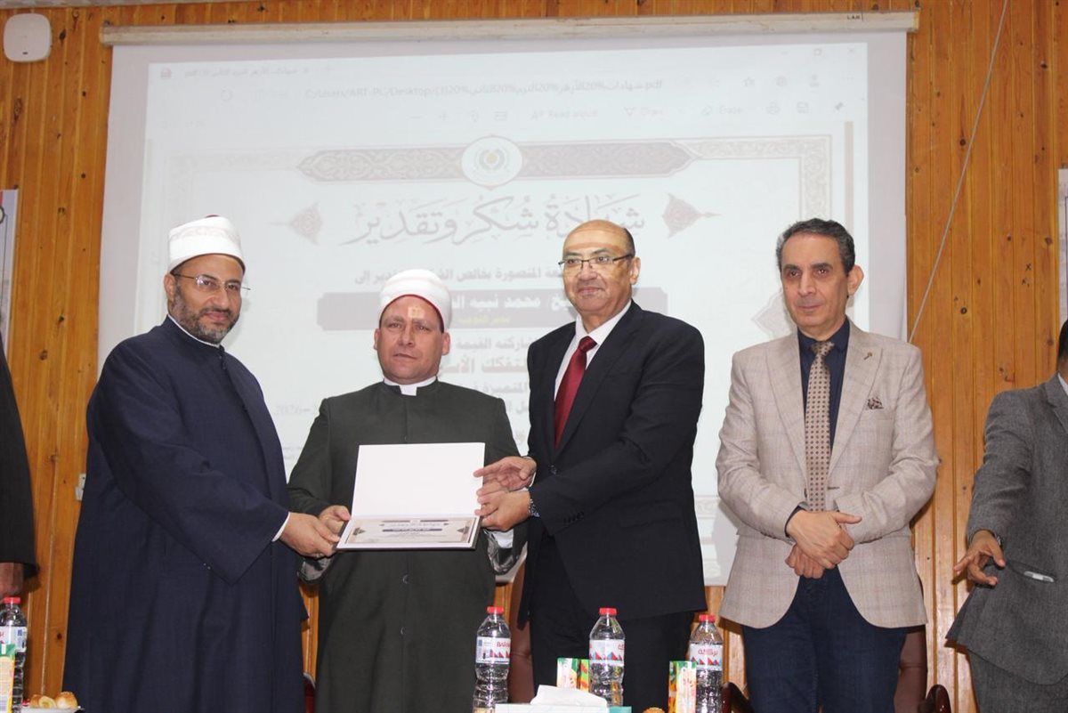 وفي ختام تم تكريم وعاظ الأزهر الشريف بمنطقة وعظ الدقهلية، تقديرًا لجهودهم المتميزة في نشر الفكر الوسطي، ومشاركتهم الفاعلة في تقديم البرامج الدعوية والتوعوية لطلاب الجامعة خلال شهر رمضان وعلى مدار الفصل الدراسي الثاني.